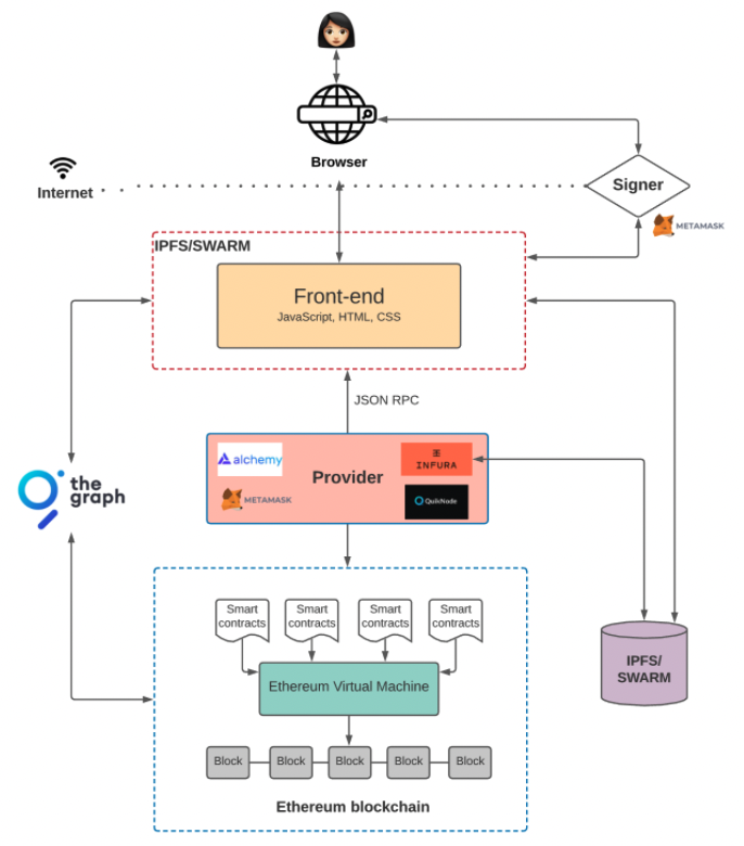 프론트엔드 코드는 이더리움 블록체인에 있는 데이터와 코드를 사용하고, 트랜잭션을 실행하기 위해 블록체인의 노드들 중 하나와 상호작용을 해야 한다. 노드를 사용하는 방법은 크게 두 가지가 있다.