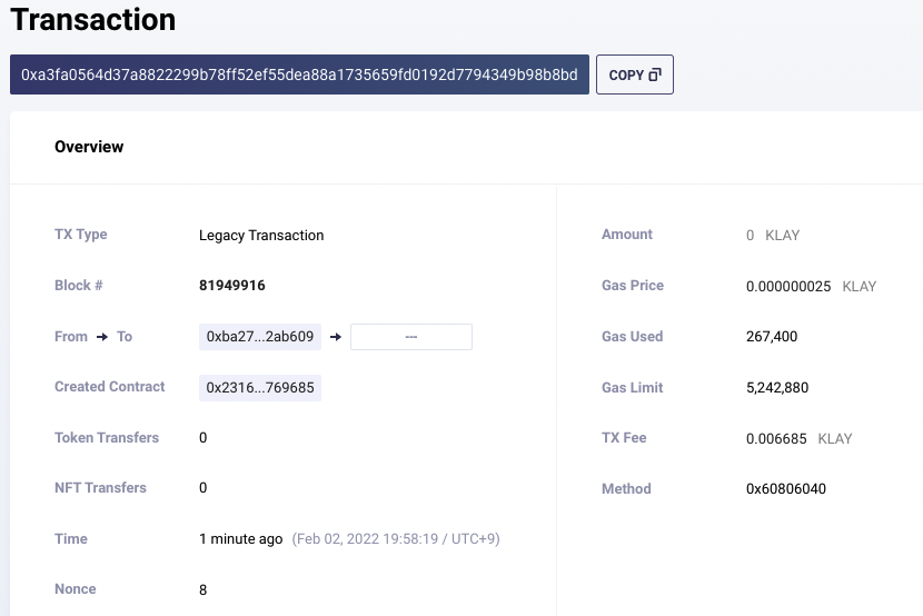 배포하는데 사용된 cost도 확인할 수 있는데, Klay가 아닌 ETH로 표기되는 것을 볼 수 있다.