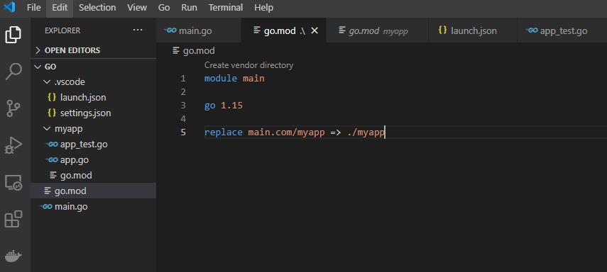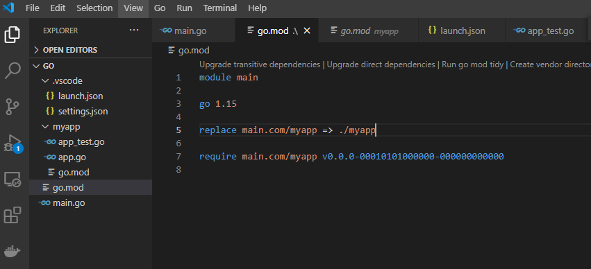 2. 밑과 같이 go.mod에서 replace 문을 통하여 main.com/myapp module path를 relative path로 바꿔준다.