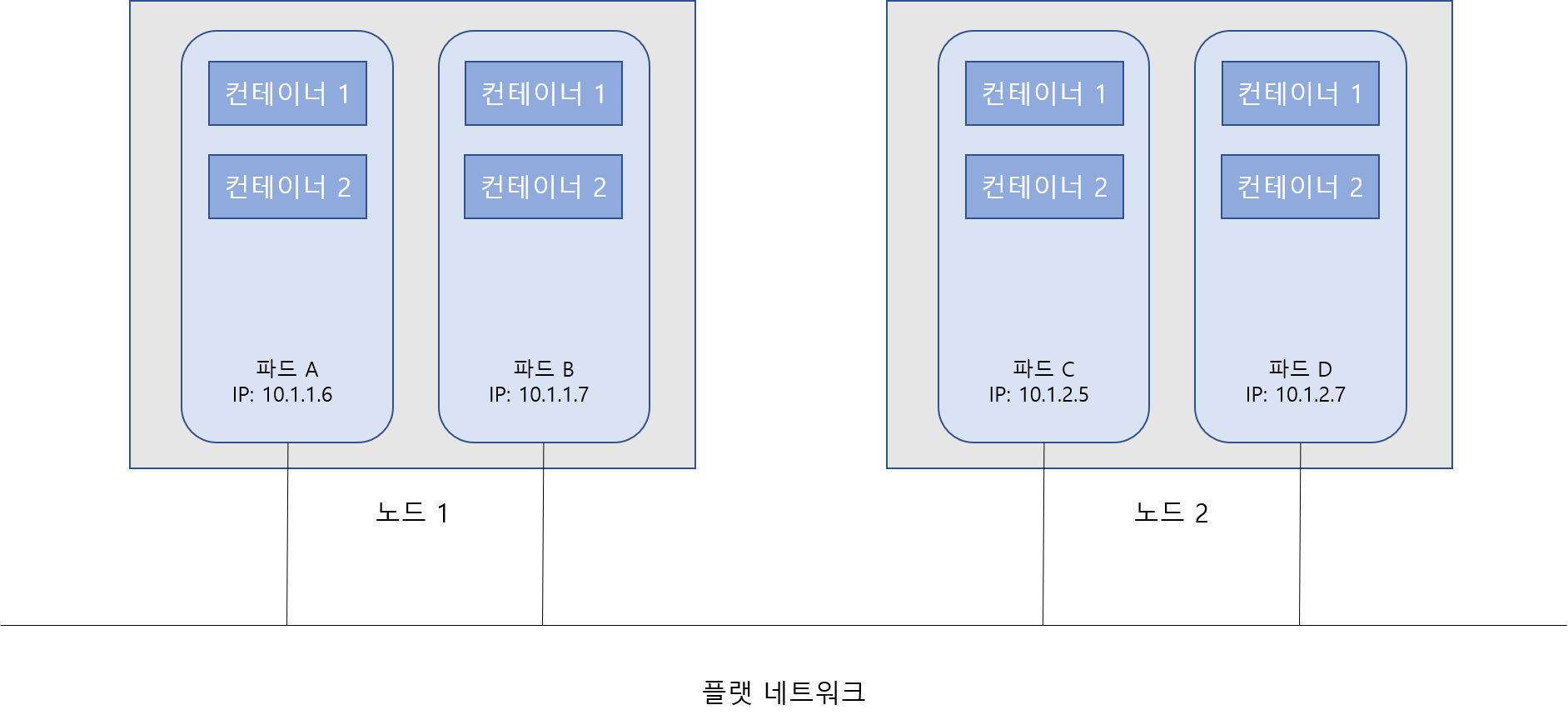- 클러스터의 모든 파드는 하나의 플랫한 공유 네트워크 주소 공간에 상주하므로 모든 파드는 다른 파드의 IP 주소를 사용해 접근하는 것이 가능.