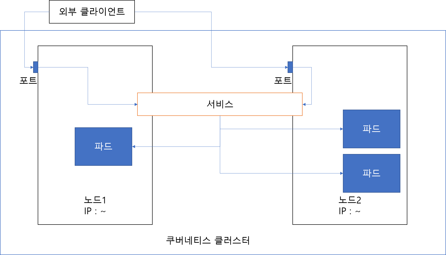 - 수평 스케일링은 여러 파드가 동일한 서비스를 제공함. 각 파드는 고유한 IP 주소가 있지만 클라이언트는 그것에 상관이 없어야 하므로 단일 IP 주소로 액세스 할 수 있어야 한다