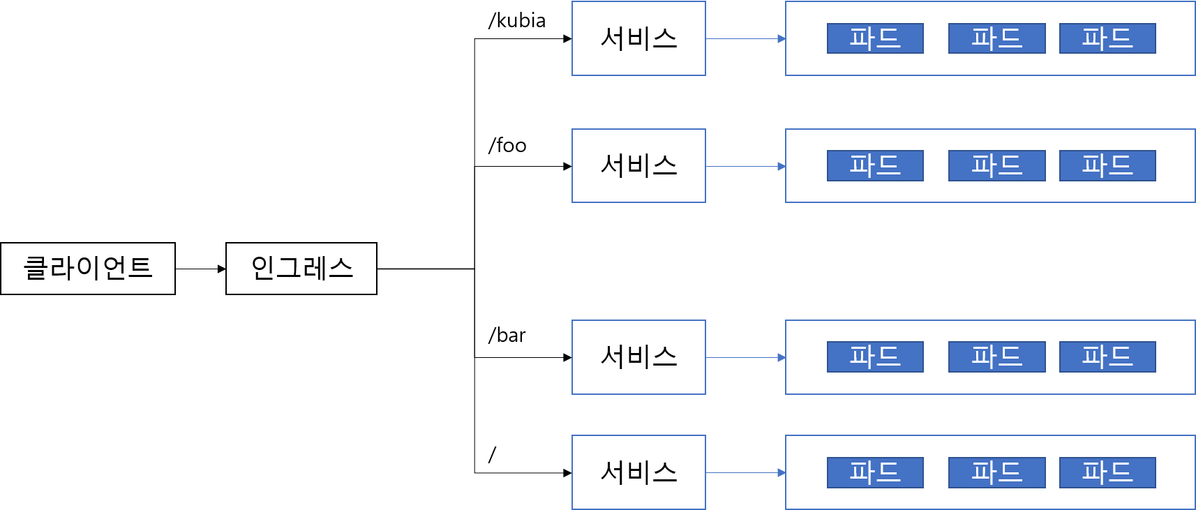 HTTP 요청을 인그레스한테 보내면 호스트와 경로에따라 요청을 전달할 서비스가 결정된다.