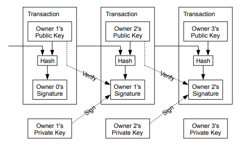 디지털 서명을 체인으로 하는 전자 코인을 하나 정의해보자. 각 주인은 코인을 옮길 때 이전 트랜잭션과 다음 주인의 퍼블릭 키의 해시를 사인하고(자신의 프라이빗 키로) 이를 코인의 끝에 추가한다. 받는 사람은 이전 주인의 퍼블릭키를 이용해 체인의 ownership을 인증할 수 있다